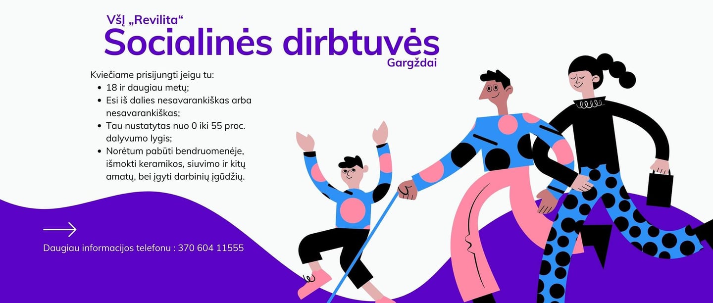 VšĮ „Revilita“ nuo 2024 metų dalyvauja projekte „Perėjimas nuo institucinės globos prie bendruomeninių paslaugų Sostinės regione, Vidurio ir vakarų Lietuvos regione“ Nr. 07-018-P-0001. Socialinių dirbtuvių tikslas - ugdyti darbingo amžiaus asmenų, turinčių intelekto ir (ar) psichikos negalią, socialinius ir darbinius įgūdžius, skatinti jų savarankiškumą ir gyvenimą bendruomenėje. Atsižvelgiame į asmenų individualius poreikius, užimtumą atviroje darbo rinkoje. Socialinių dirbtuvių funkcija – darbinių įgūdžių formavimas, rinkoje paklausių prekių ir paslaugų gaminimas ir realizavimas bei šalies darbdavių informavimas ir švietimas. Paslaugos teikiamos Klaipėdos rajono darbingo amžiaus gyventojams, kuriems nustatytas nuo 0 iki 55proc. darbingumo arba dalyvumo lygis, dėl turimų proto ir (ar) psichikos sutrikimų. Projekto trukmė: 40 mėnesių. Projekto vykdytojas: Asmens su negalia teisių apsaugos agentūra prie Lietuvos Respublikos socialinės apsaugos ir darbo ministerijos. Projekto partneriai: Klaipėdos rajono savivaldybės administracija.